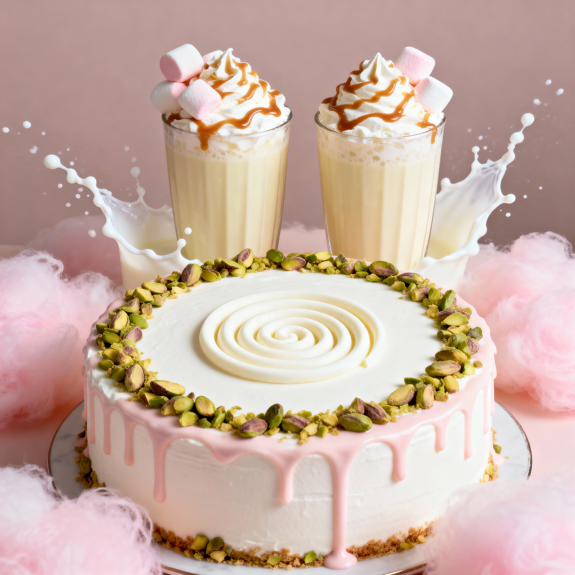 This is the ultimate cake destination for all things perfect. Imagine a sweet vanilla cake, with pistachio cream, bianco latte and fluffy marshmallow with a hint of spun sugar and caramel drizzle….