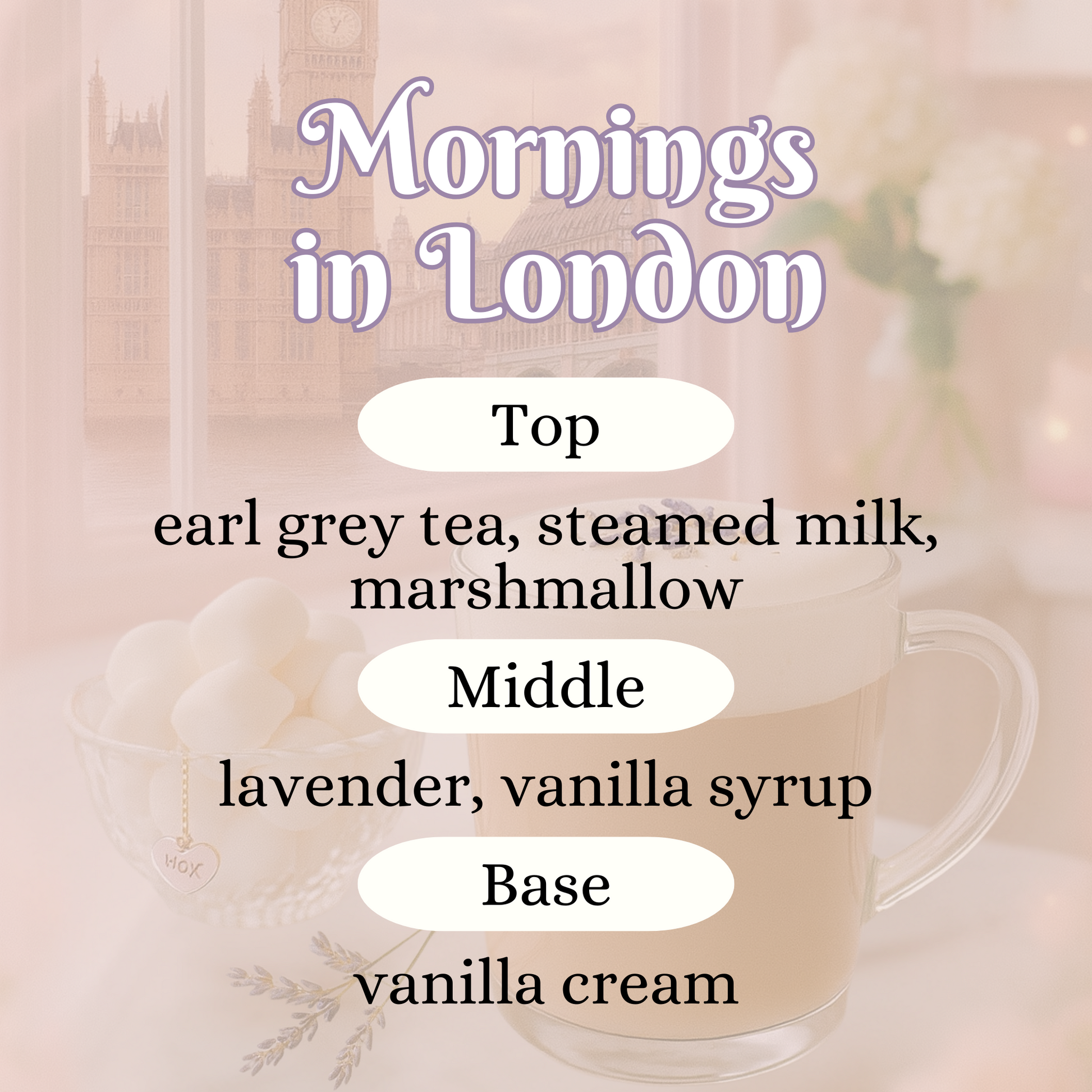 Mornings in London wraps you in the warmth of an earl grey tea, where soft steamed milk and fluffy marshmallow melt into soothing lavender and a drizzle of vanilla syrup. A creamy vanilla base lingers like the comfort of a quiet café on a foggy morning.☕️🥛