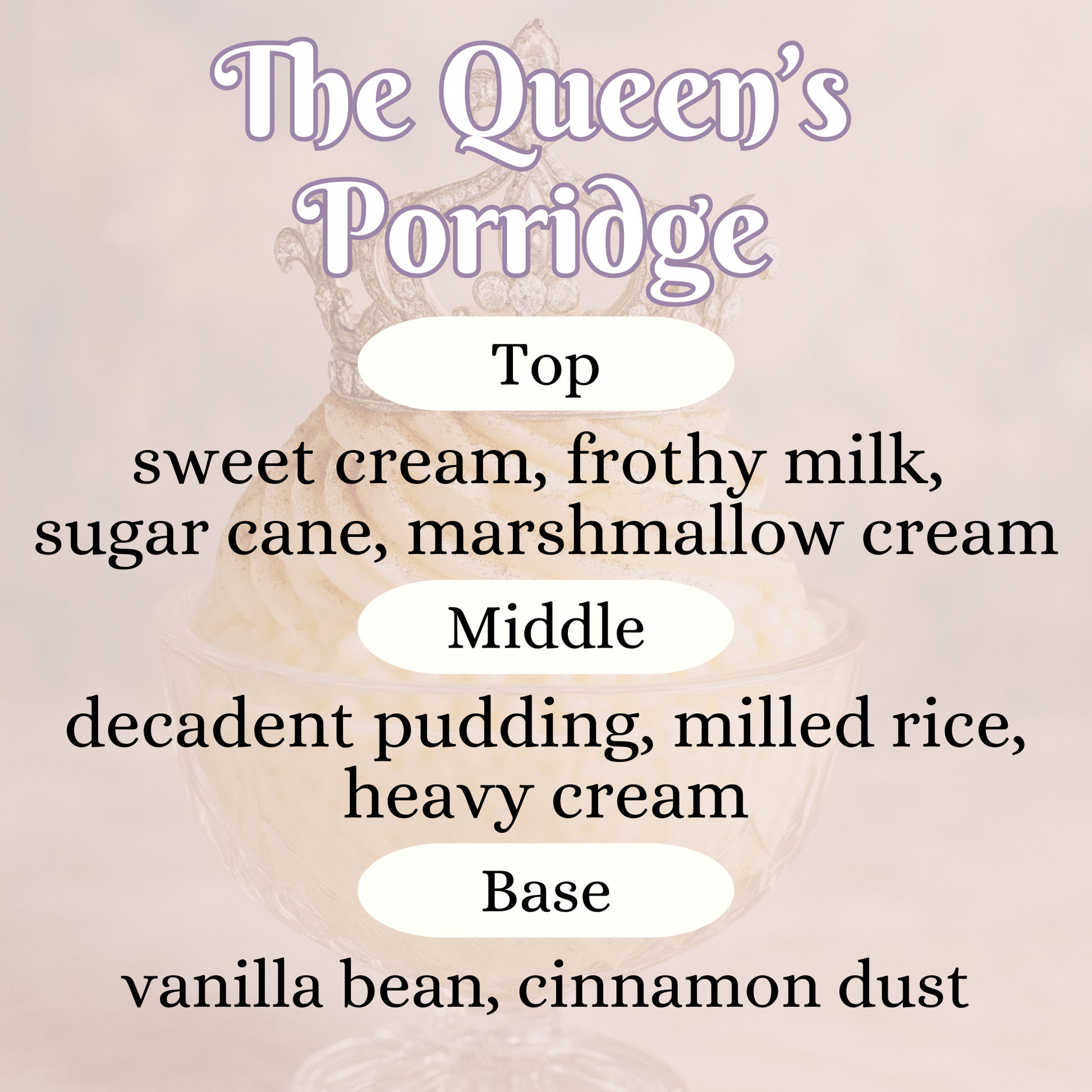 The Queen’s Porridge – Fit for royalty… and anyone who believes breakfast should be served in a diamond-encrusted bowl. This cozy-yet-regal gourmand blends sweet cream, frothy milk, and marshmallow cream with a rich swirl of decadent pudding and milled rice, all crowned with vanilla bean and a whisper of cinnamon dust. It’s basically the royal decree for smelling like the palace kitchen at 9 a.m.—minus the servants. 👑✨ 🥮